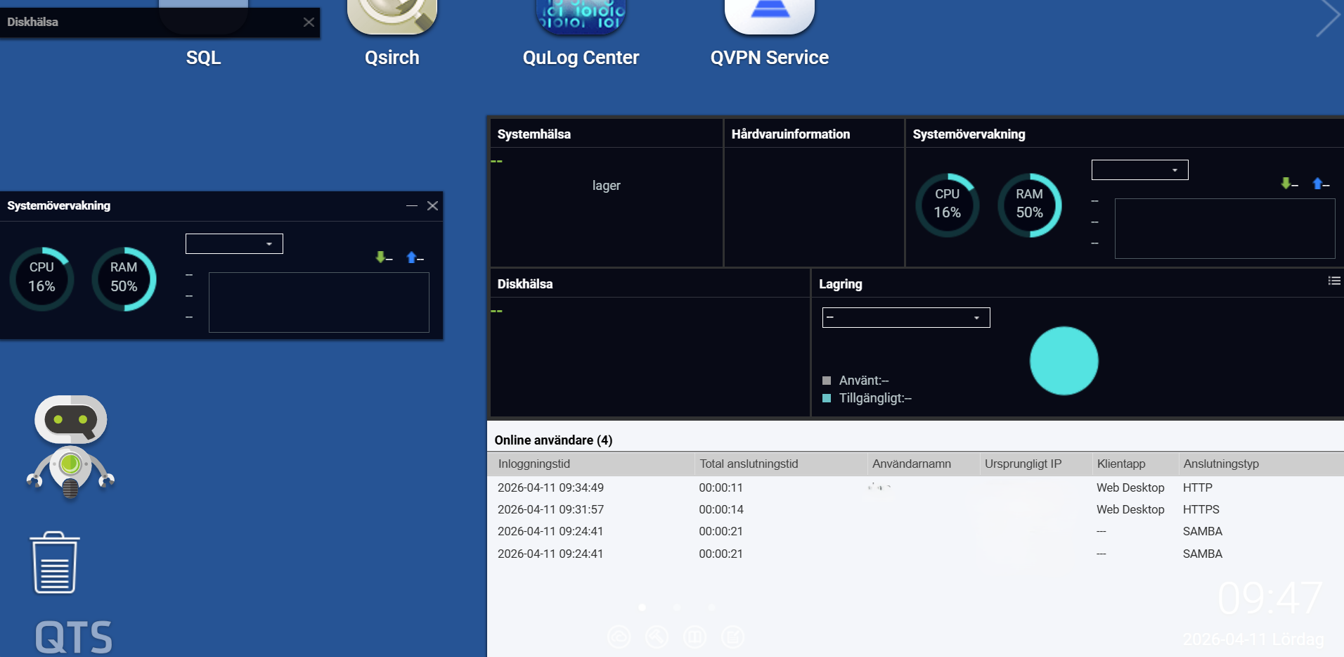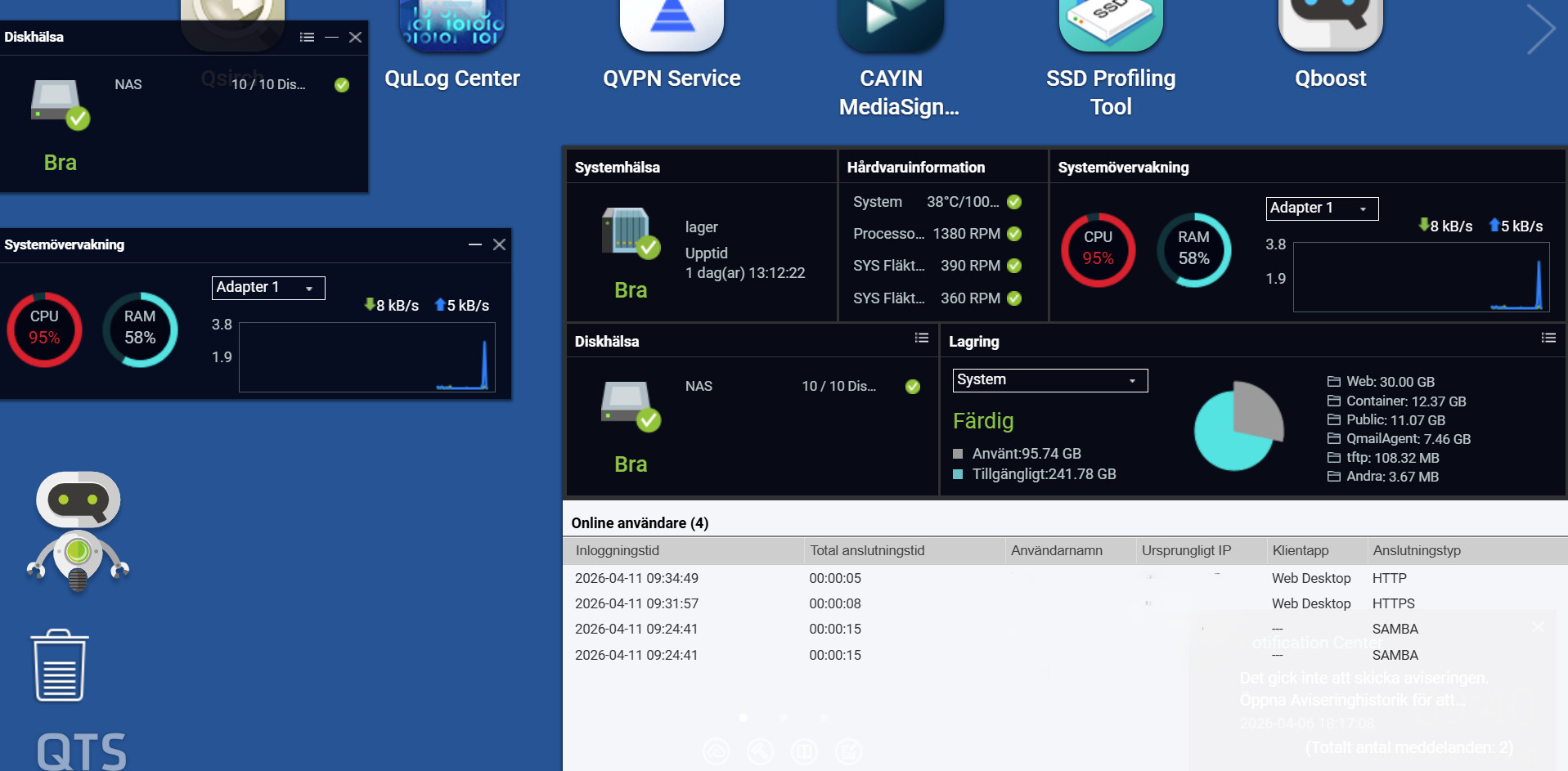 我們了解到先前「無法更新設定,系統分割區已滿」的問題已經解決,但您現在在本地登入時出現異常的 UI 行為,包括儀表板元素和資源監控器資訊與透過 myQNAP 登入時有所不同。