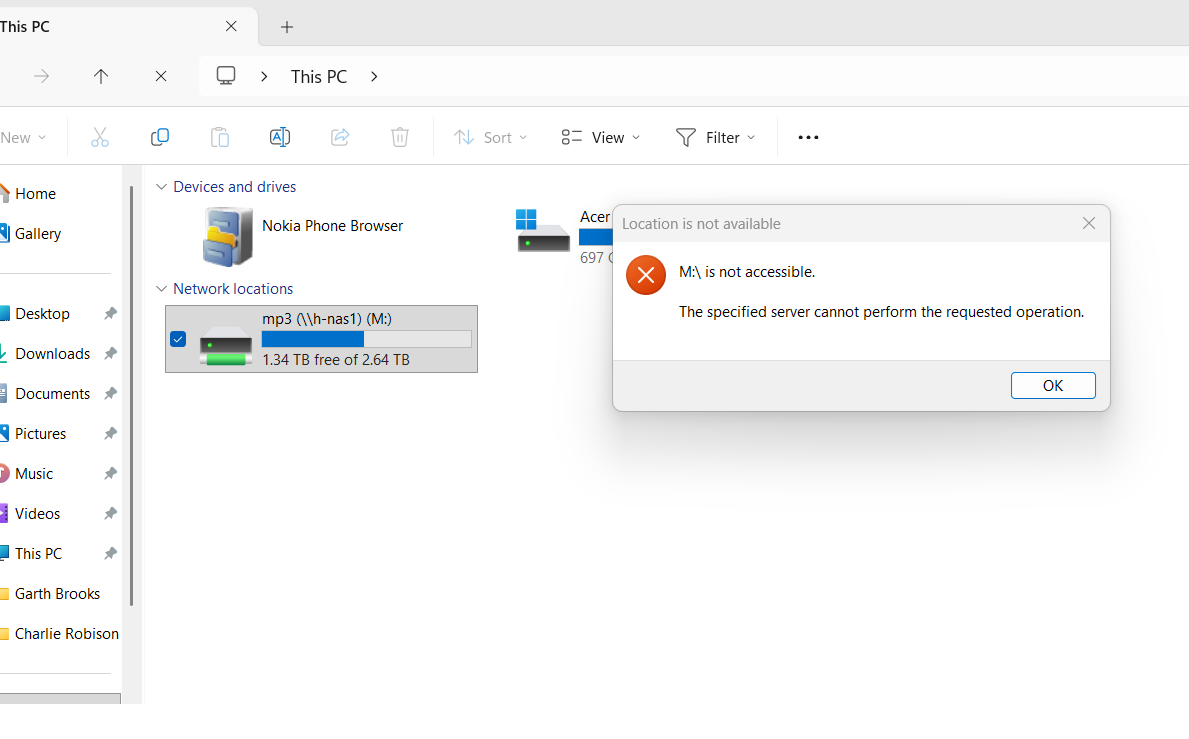 Whichever one I use, I can access the folders and files from the command prompt (I can copy files, I can play videos in VLC, etc etc), but attempting to access the M:\ drive from Windows explorer just gives “M:\ is not accessible. The specified server cannot perform the requested operation.”